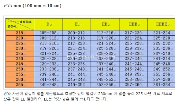 인터넷을 엄청 뒤지면.. 신발 사이즈에 대해서는 나오는데 이것도 각 업체마다 다른데다가 발볼에 대해서는 유럽이 너무 다른게 많았다.. ㅠ.ㅠ