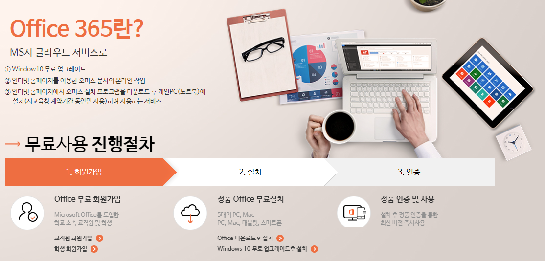 아이가 학교를 다니고 있으면 Office365와 Windows10 을 무료로 쓸수 있는 계정을 가질 수 있다. https://o365.ice.go.kr/ 인천광역시 교육청 o365.ice.go.kr 인천광역시 교육청에서 지원하고 있는 것이며 각 교육청에서 찾아볼수 있다. 5대의 PC와 태블릿에서 쓸수 있는 것으로 알고 있다. 순서는 1. 학교 번호 검색 2. 담임 선생님과 통화(작년 담임 선생님) - 정보 담당자 연결 3. 정보 담당자 전화 - 링크를 폰 번호로 알려줌. 4. 인천광역시 교육청 (https://o365.ice.go.kr/) 접속 6. 학생 계정 생성 후 로그인(아이 반, 번호까지 알아야 함) 위와 같은 순서로 확인하여 사용하면 된다.